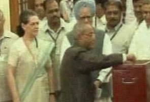New Delhi: With a tilak on his forehead a confident Pranab Mukherjee cast his vote in Parliament today. He was flanked by PM Manmohan Singh and UPA chairperson Sonia Gandhi, and looked all set to take over the top job.